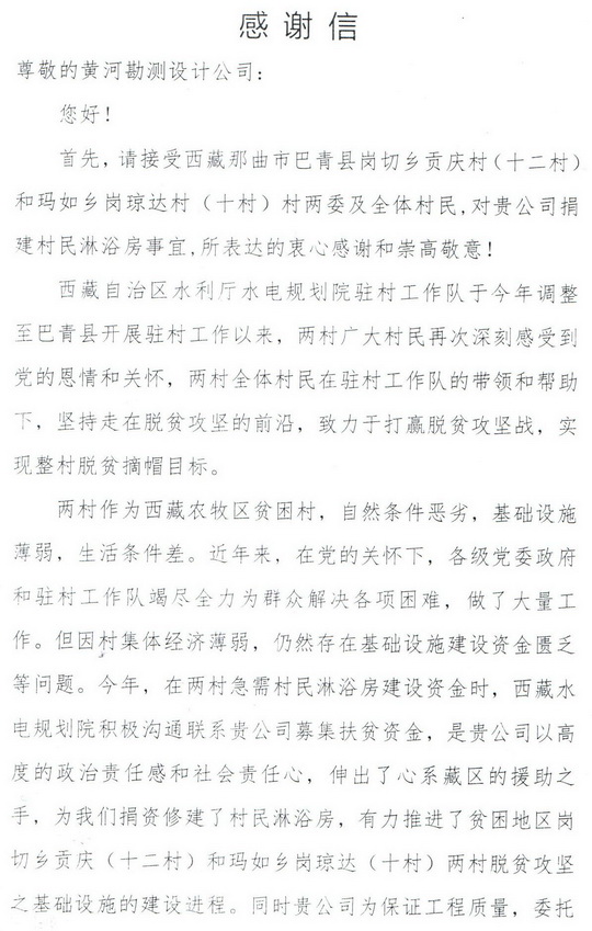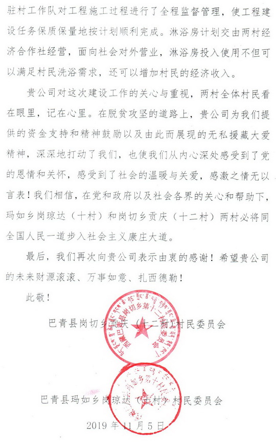 近日,公司黨委收到西藏自治區那曲市巴青縣崗切鄉貢慶村(十二村)和瑪如鄉崗瓊達村(十村)兩村村民委員會(huì )及全體村民發(fā)來(lái)的感謝信,向公司黨委捐資修建農村基礎設施表達衷心的感謝和誠摯的敬意。