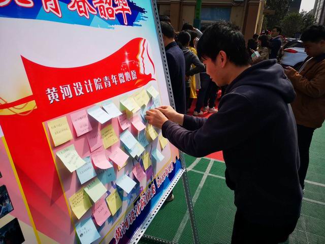 在志愿者的引導下,青年同志們在即時(shí)貼上用筆寫(xiě)出了自己在紀念五四運動(dòng)100周年到來(lái)之際的"微心愿",粘貼在展板"黃河設計院青年微心愿"欄上,有對自己的工作、生活的小目標,但更多的是公司青年職工對公司發(fā)展"蒸蒸日上""越來(lái)越好""健康發(fā)展"的愛(ài)企向往。"微心愿"鼓舞著(zhù)著(zhù)青年職工發(fā)揚五四精神,堅定理想信念,樹(shù)立目標志向,為之努力奮斗,貢獻治黃事業(yè),既做"奮斗者"又做"圓夢(mèng)人"。